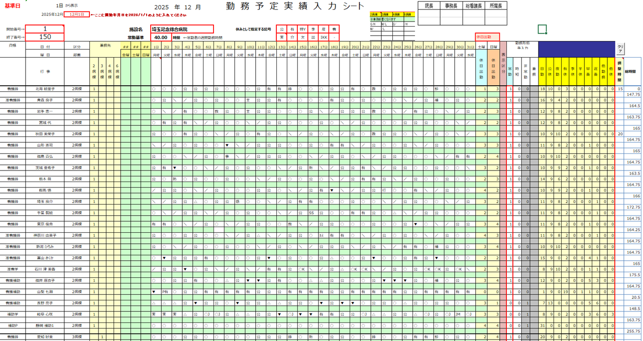 ※配布しているEXCELsheetは100人分の勤務表作成ができますが、製品版は150名までの勤務表作成が可能です。