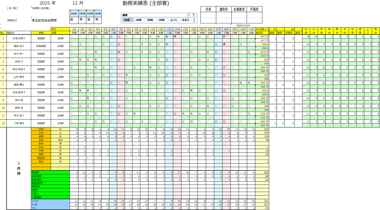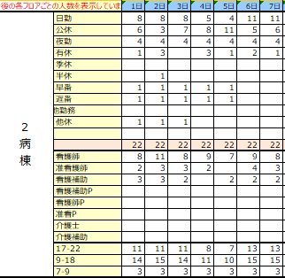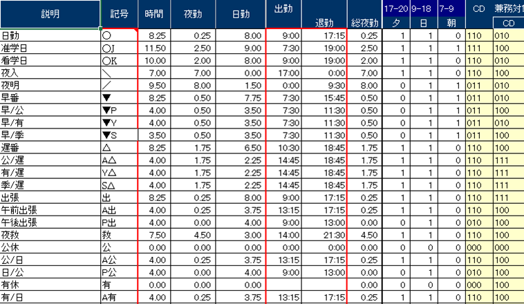 看護師、看護補助の振り分けはもちろん、勤務記号から夜勤時間、日勤時間へ変換します。