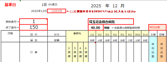 1)基準日・・・勤務表の開始日を「2025-08-01」のように入力すると日付下の曜日が変更になります(基本設定)