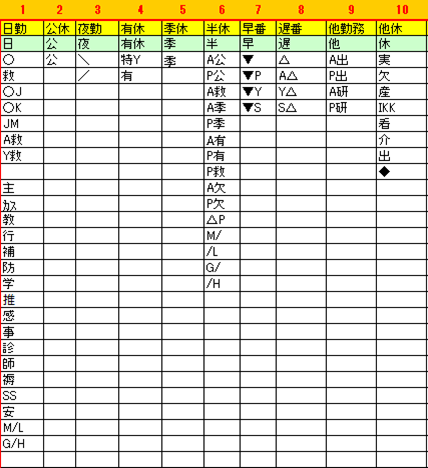 1)「記号」は勤務表で使う勤務記号です